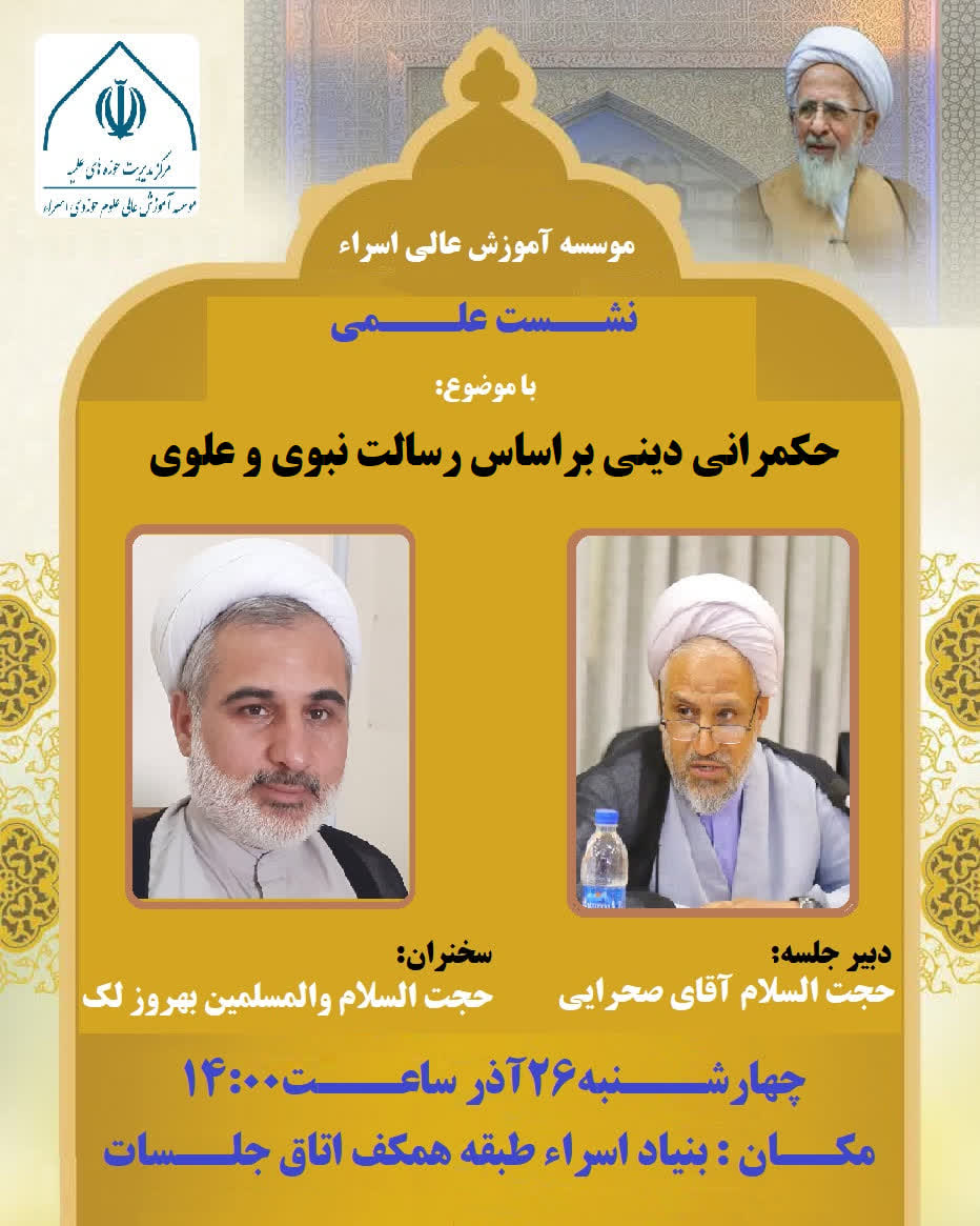 ​​​​​نشست علمی «حکمرانی دینی بر اساس رسالت نبوی و علوی» روز چهارشنبه ۲۶ آبان‌ماه، ساعت ۱۴، در سالن کنفرانس بنیاد بین‌المللی علوم وحیانی اسراء برگزار خواهد شد.