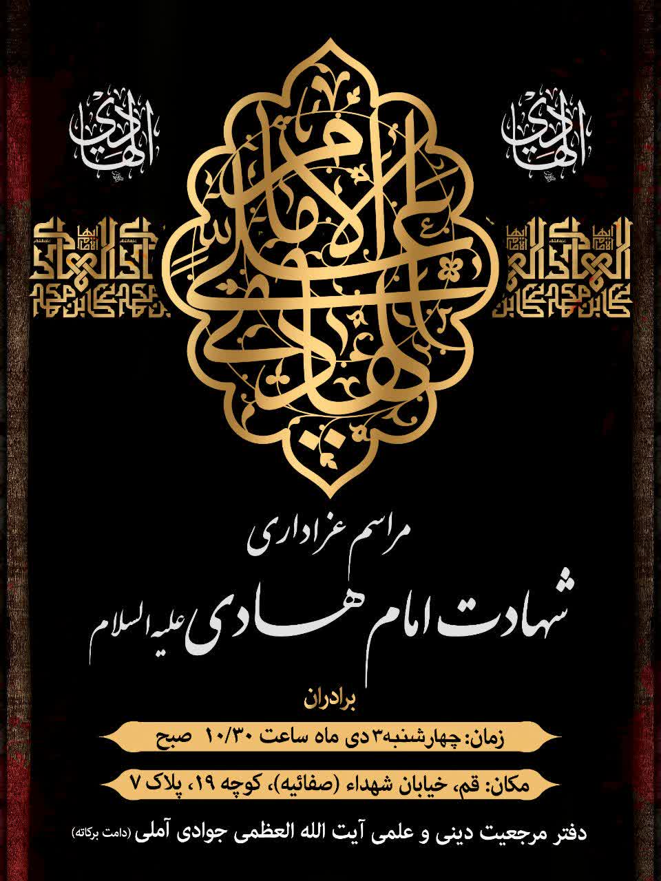 به اطلاع می رساند مراسم سوگواری به مناسبت فرا رسیدن سالروز شهادت حضرت امام هادی سلام الله علیه در دفتر آیت الله العظمی جوادی آملی در قم برگزار میگردد.