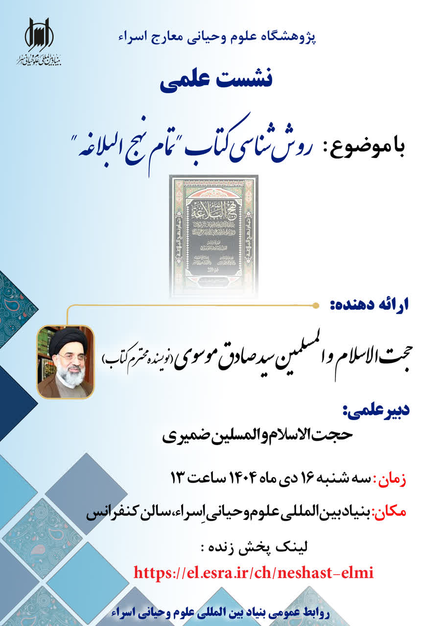نشست علمی پژوهشگاه علوم وحیانی معارج با موضوع: روششناسی کتاب "تمام نهج البلاغه" و ارائه حجت الاسلام و المسلمین سید صادق موسوی (نویسنده محترم کتاب) در محل بنیاد اسراء برگزار می گردد.